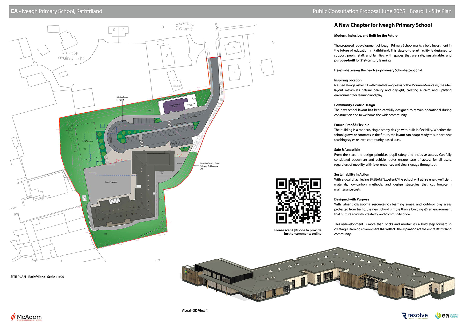 On behalf of Iveagh Primary School, welcome to the Digital Public Information Event for their plans to provide a new primary school building at Castle Hill, Rathfriland.